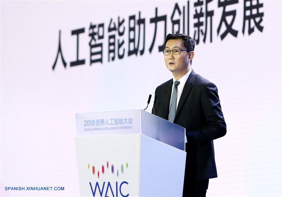 SHANGHAI, septiembre 17, 2018 (Xinhua) -- El presidente y director ejecutivo del gigante de internet Tencent, Ma Huateng, pronuncia un discurso inaugural en un foro de la Conferencia Mundial de Inteligencia Artificial (IA) 2018, en Shanghai, en el este de China, el 17 de septiembre de 2018. El certamen, de tres días de duración, cuenta con la participación de expertos, académicos y empresarios de unos 40 países y regiones. Más de 200 grandes compa?ías de IA participan en la conferencia y en las actividades de exhibición. (Xinhua/Fang Zhe)