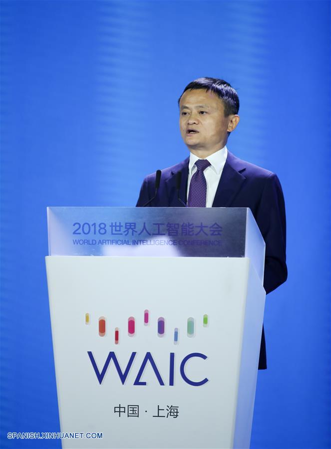 SHANGHAI, septiembre 17, 2018 (Xinhua) -- El presidente y co-fundador de Alibaba, Jack Ma, pronuncia un discurso inaugural en un foro de la Conferencia Mundial de Inteligencia Artificial (IA) 2018, en Shanghai, en el este de China, el 17 de septiembre de 2018. El certamen, de tres días de duración, cuenta con la participación de expertos, académicos y empresarios de unos 40 países y regiones. Más de 200 grandes compa?ías de IA participan en la conferencia y en las actividades de exhibición. (Xinhua/Ding Ting)