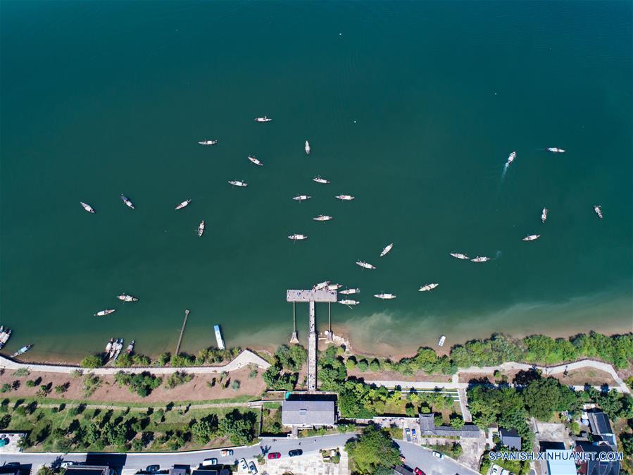 Vista aérea de personas pescando en el río Fuchun, en la villa de Dongziguan en el distrito de Fuyang de Hangzhou, capital de la provincia de Zhejiang, en el este de China, el 18 de septiembre de 2018. Con una historia de 1,000 a?os, la villa de Dongziguan ofrece transporte terrestre y acuático conveniente. Los residentes realizan fiestas en el oto?o para celebrar la cosecha de la pesca. (Xinhua/Xu Yu)