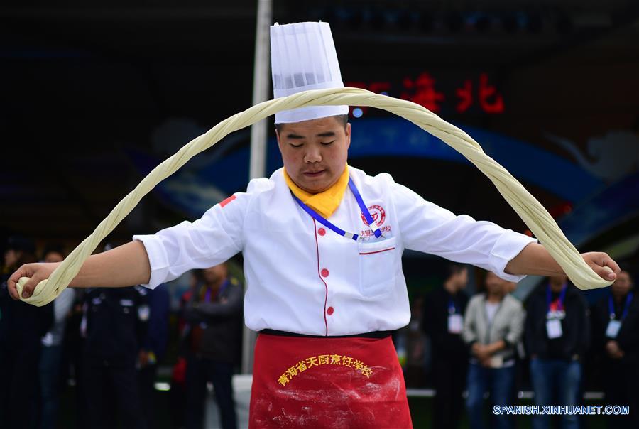 QINGHAI, septiembre 18, 2018 (Xinhua) -- Un chef presenta sus habilidades de elaboración de fideos Lamian estirados a mano durante un concurso de cocina, en el distrito de Ledu de la ciudad de Haidong, provincia de Qinghai, en el noroeste de China, el 18 de septiembre de 2018. (Xinhua/Zhang Hongxiang)