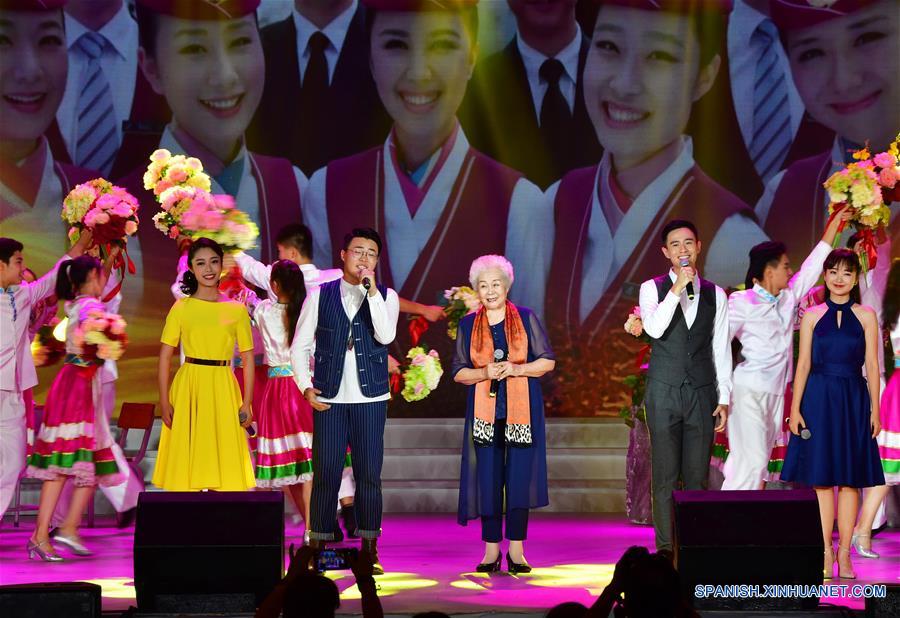 FUJIAN, septiembre 18, 2018 (Xinhua) -- Imagen del 17 de septiembre de 2018 de la soprano Yu Shuzhen (c), y estudiantes de la Universidad de Xiamen cantando durante un espectáculo llevado a cabo para saludar al próximo Festival de Medio Oto?o, en Xiamen, provincia de Fujian, en el sureste de China. (Xinhua/Wei Peiquan)