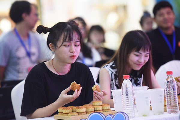 Una mujer come pasteles de luna durante un concurso de comer pasteles. [Foto de Long Wei / Asianewsphoto]