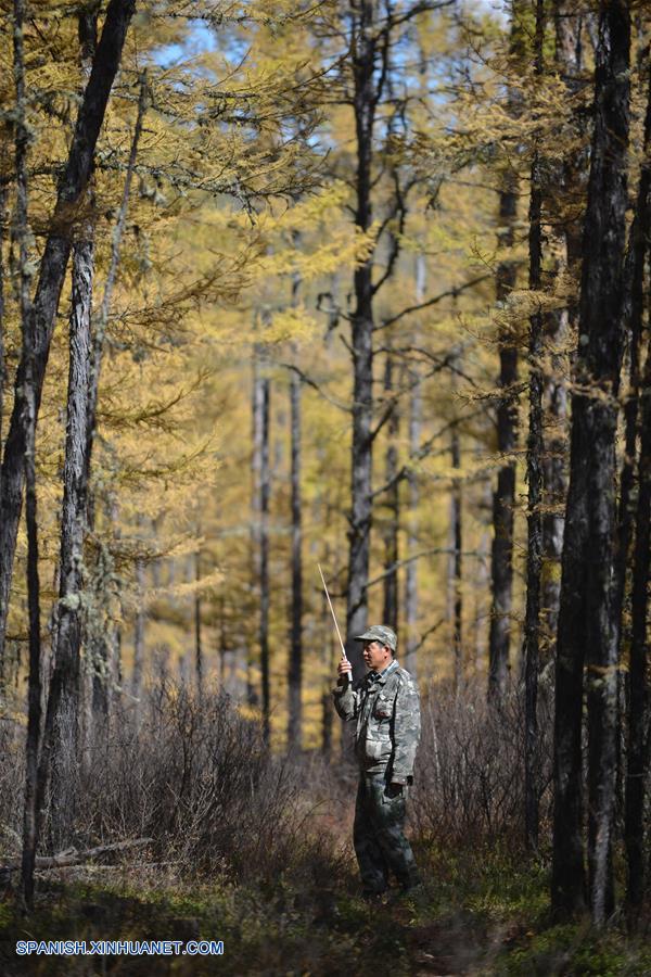 GENHE, septiembre 19, 2018 (Xinhua) -- Imagen del 18 de septiembre de 2018 del guardabosques Lian Lichen usando un "walkie-talkie" para comunicarse con su colega en la Finca Forestal Yue'anli de la oficina forestal de Genhe en las monta?as Gran Khingan de la Región Autónoma de Mongolia Interior, en el norte de China. Los empleados de la Finca Forestal Yue'anli son responsables de la conservación y el trabajo de cría de renos en China. (Xinhua/Zou Yu)