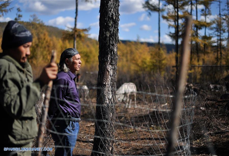 GENHE, septiembre 19, 2018 (Xinhua) -- Imagen del 18 de septiembre de 2018 del guardabosques Zhang Guohua cuidando de un reno en la Finca Forestal Yue'anli de la oficina forestal de Genhe en las monta?as Gran Khingan de la Región Autónoma de Mongolia Interior, en el norte de China. Los empleados de la Finca Forestal Yue'anli son responsables de la conservación y el trabajo de cría de renos en China. (Xinhua/Yu Yang)
