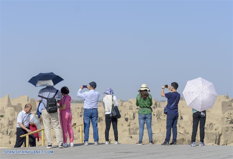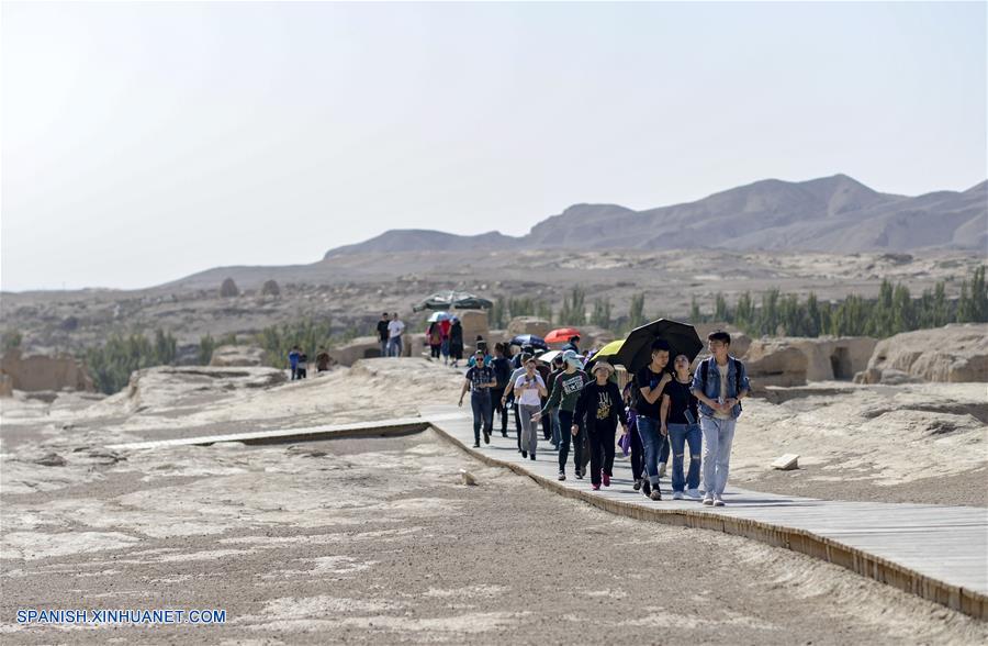 XINJIANG, septiembre 20, 2018 (Xinhua) -- Imagen del 19 de septiembre de 2018 de turistas visitando las ruinas de la antigua ciudad de Jiaohe en Turpan, en la Región Autónoma Uygur de Xinjiang, en el noroeste de China. Xinjiang vio más de 105 millones de turistas en los primeros ocho meses de 2018, un 40.93 por ciento interanual, de acuerdo con la Comisión de Desarrollo del Turismo de Xinjiang. (Xinhua/Zhao Ge)