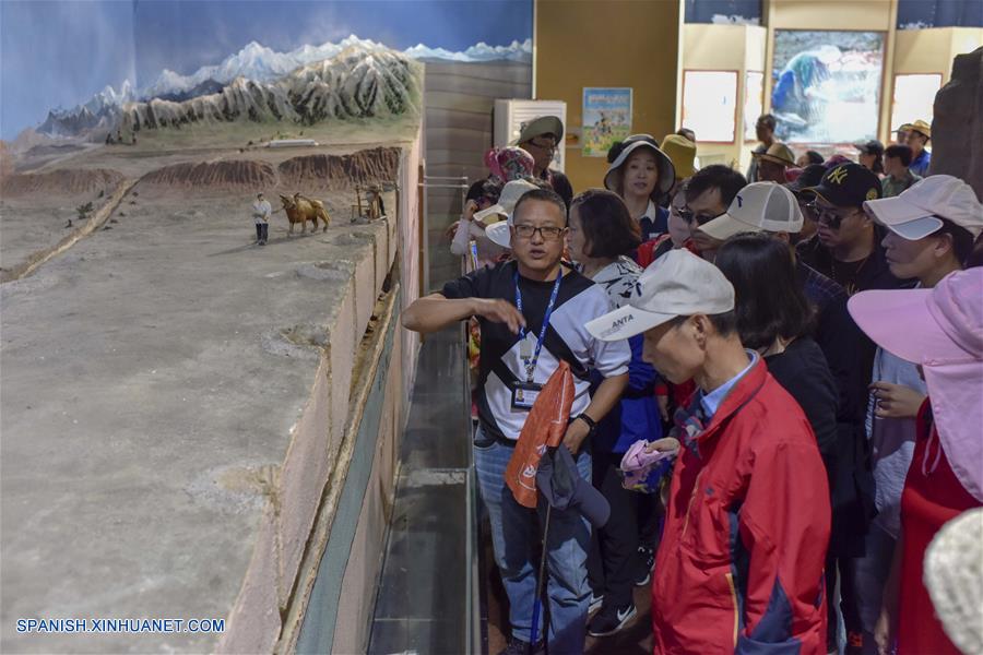 XINJIANG, septiembre 20, 2018 (Xinhua) -- Imagen del 19 de septiembre de 2018 de turistas observando un modelo de pozos karez, que llevan agua desde el subsuelo hasta la superficie, en un parque en Turpan, en la Región Autónoma Uygur de Xinjiang, en el noroeste de China. Xinjiang vio más de 105 millones de turistas en los primeros ocho meses de 2018, un 40.93 por ciento interanual, de acuerdo con la Comisión de Desarrollo del Turismo de Xinjiang. (Xinhua/Zhao Ge)