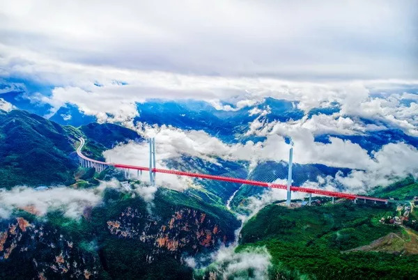 Beipanjiang, que tiene una altura similar a un edificio de 200 pisos, es uno de los tres puentes de la sección Bijie-Duge de la autopista Hangzhou-Ruili que conecta a Hangzhou, en la provincia de Zhejiang con Ruili, en la provincia de Yunnan.