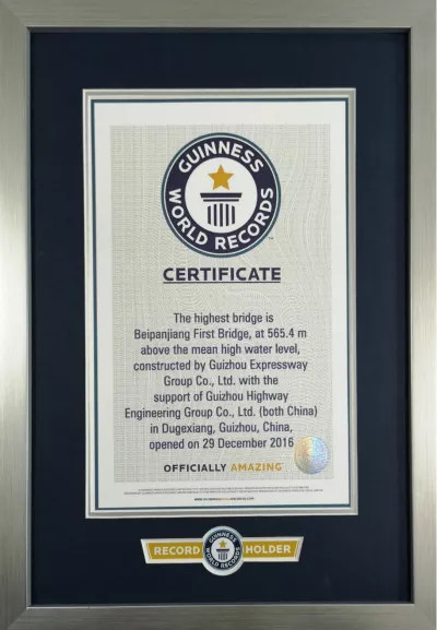 Certificado del récord Guinness a favor del puente Beipanjiang, el más alto del mundo.