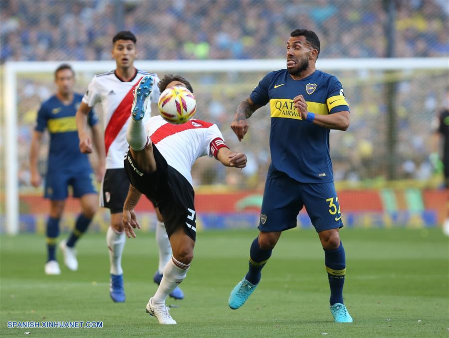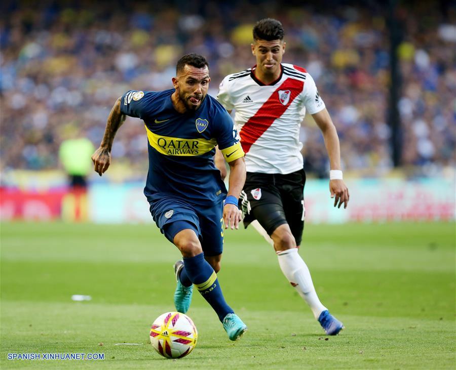 BUENOS AIRES, septiembre 23, 2018 (Xinhua) -- El jugador Carlos Tévez (i), de Boca Juniors, disputa el balón con Rafael Borré (d), de River Plate, durante el partido correspondiente a la fecha 6 de la Superliga argentina, celebrado en el estadio Diego J. Armando, conocido como "La Bombonera", en la ciudad de Buenos Aires, capital de Argentina, el 23 de septiembre de 2018. (Xinhua/Martín Zabala)