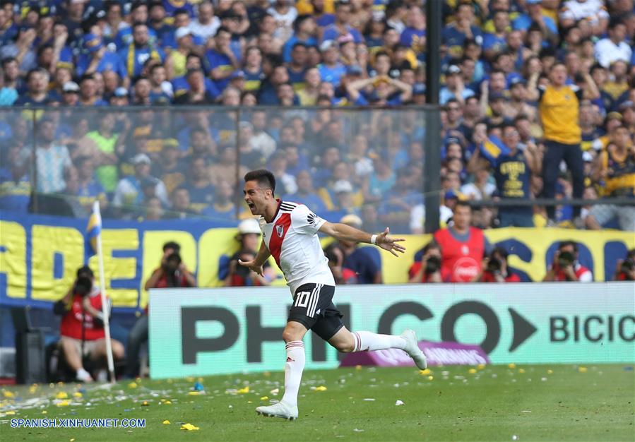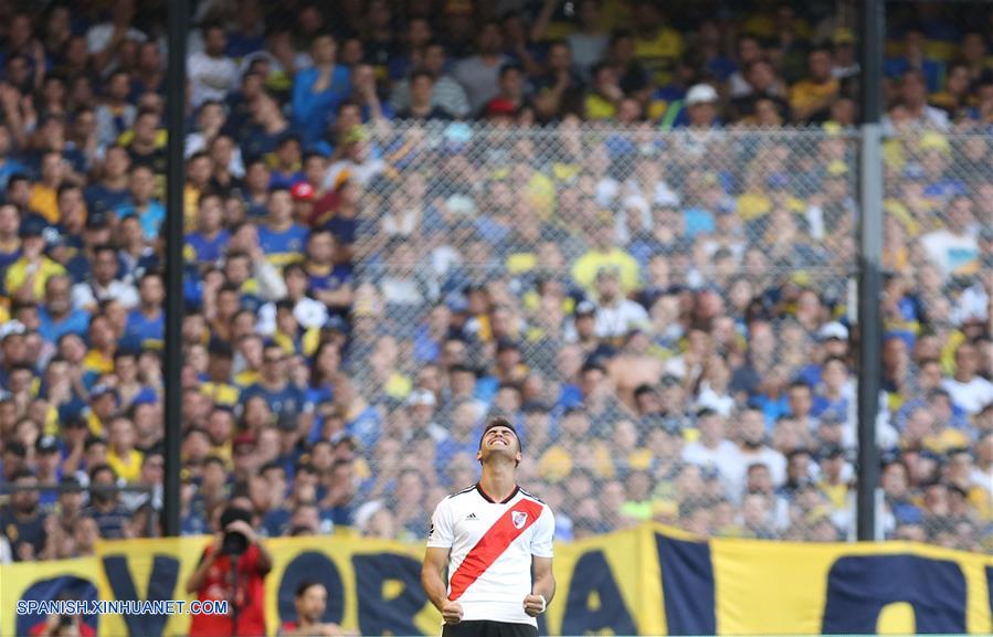 BUENOS AIRES, septiembre 23, 2018 (Xinhua) -- El jugador Gonzalo Martínez, de River Plate, festeja su anotación durante el partido correspondiente a la fecha 6 de la Superliga argentina, ante Boca Juniors, celebrado en el estadio Diego J. Armando, conocido como "La Bombonera", en la ciudad de Buenos Aires, capital de Argentina, el 23 de septiembre de 2018. (Xinhua/Martín Zabala)