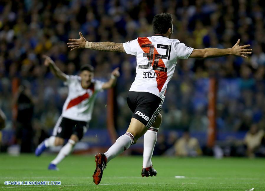 BUENOS AIRES, septiembre 23, 2018 (Xinhua) -- El jugador Ignacio Scocco (2-d), de River Plate, festeja su anotación durante el partido correspondiente a la fecha 6 de la Superliga argentina, ante Boca Juniors, celebrado en el estadio Diego J. Armando, conocido como "La Bombonera", en la ciudad de Buenos Aires, capital de Argentina, el 23 de septiembre de 2018. (Xinhua/Martín Zabala)