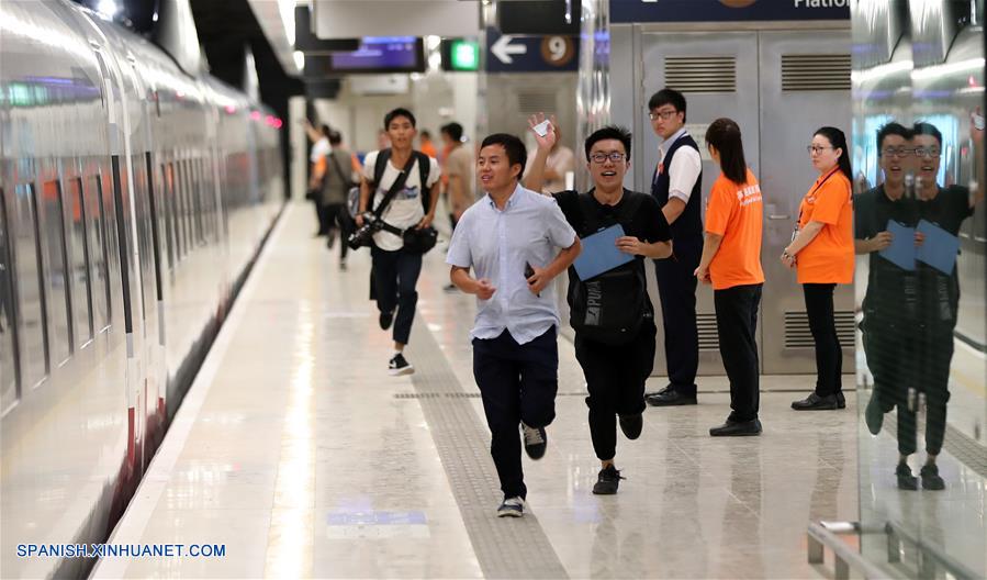 HONG KONG, septiembre 23, 2018 (Xinhua) -- Dos pasajeros entran a la plataforma para abordar el tren en la Estación Kowloon Oeste, en Hong Kong, en el sur de China, el 23 de septiembre de 2018. El tren G5736 dejó la Estación Kowloon Oeste de Hong Kong a las 7:00 el domingo (hora local) hacia la Estación de Ferrocarriles Norte de Shenzhen. A las 6:44, el tren G5711 dejó la Estación de Ferrocarriles Norte de Shenzhen hacia la Estación Kowloon Oeste de Hong Kong, marcando la inauguración de la sección de Hong Kong del Ferrocarril Expreso Guangzhou-Shenzhen-Hong Kong, así como de la totalidad del Ferrocarril Expreso Guangzhou-Shenzhen-Hong Kong. (Xinhua/Li Gang)
