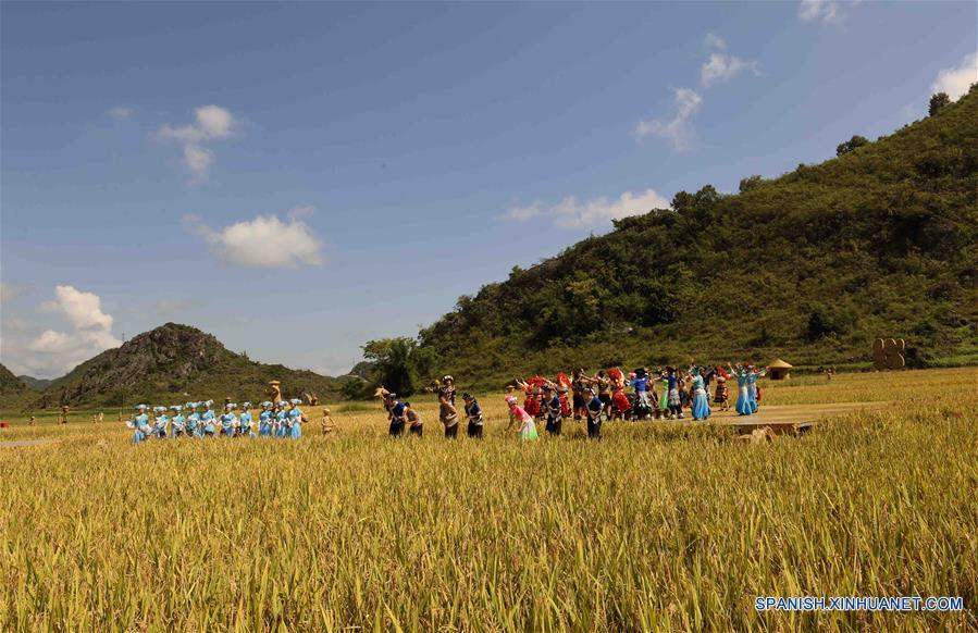 YUNNAN, septiembre 22, 2018 (Xinhua) -- Imagen del 21 de septiembre de 2018 de artistas locales y residentes realizando una actuación al aire libre con el tema de la cosecha en el oto?o en los arrozales, en la localidad Babao del condado de Guangnan, provincia de Yunnan, en el suroeste de China. (Xinhua/Yang Zongyou)