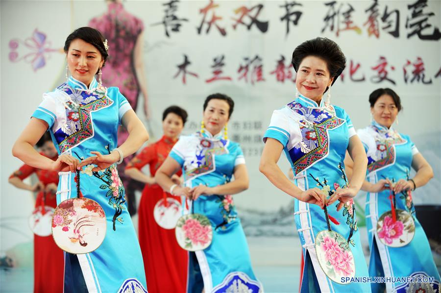 ANHUI, septiembre 24, 2018 (Xinhua) -- Imagen del 23 de septiembre de 2018 de mujeres realizando un espectáculo vestidas con cheongsam, un vestido tradicional para mujeres también conocido como Qipao, para celebrar el Festival de Medio Oto?o y el próximo Día Nacional de China, en Bozhou, provincia de Anhui, en el este de China. (Xinhua/Zhang Yanlin)