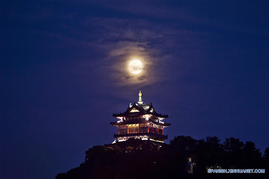 JIANGSU, septiembre 24, 2018 (Xinhua) -- Vista de la luna llena sobre la Monta?a Yuntai en Zhenjiang, provincia de Jiangsu, en el este de China, el 24 de septiembre de 2018. El Festival de Medio Oto?o, que cae el 24 de septiembre este a?o, es un festival tradicional chino que tiene por costumbre la reunión familiar. (Xinhua/Chen Gang)