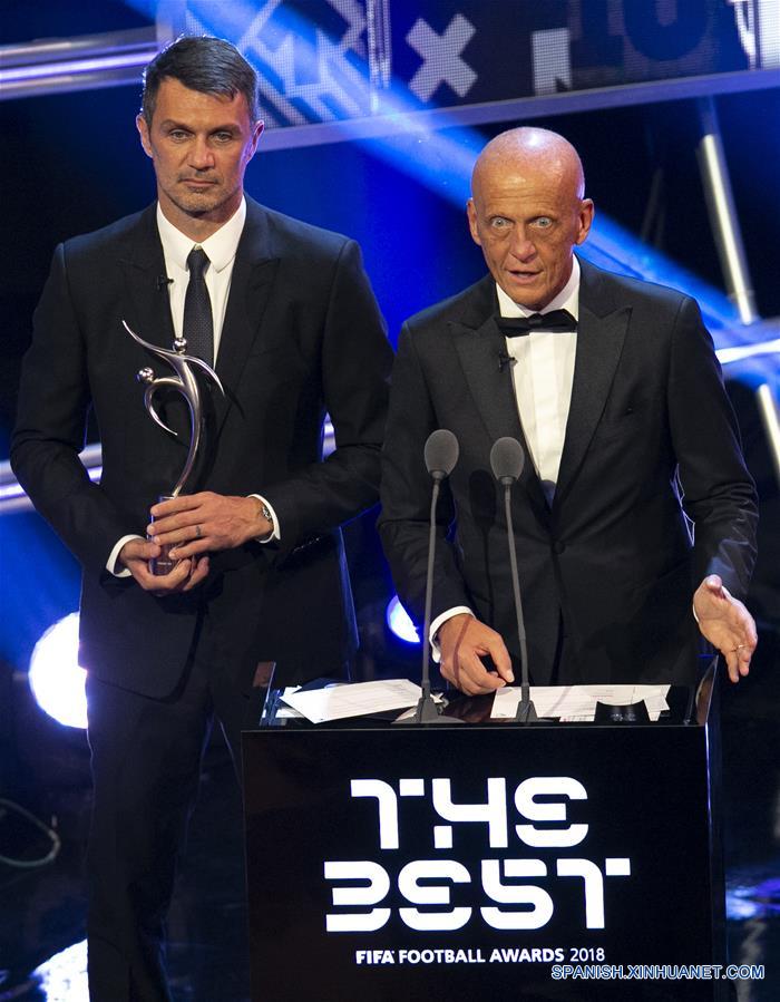 El ex árbitro italiano, Pierluigi Collina (d) presenta el Premio Fair Play de la FIFA durante los Premios "The Best FIFA 2018" en Londres, Reino Unido, el 24 de septiembre de 2018. (Xinhua/Han Yan)