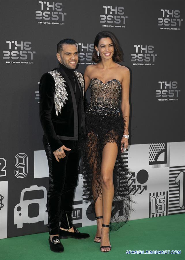 El jugador Dani Alves (i), de Paris Saint-Germain, y su esposa, Joana Sanz (d), llegan a la alfombra verde previo a los Premios "The Best FIFA 2018" en Londres, Reino Unido, el 24 de septiembre de 2018. (Xinhua/Han Yan)
