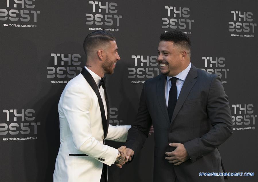 El jugador Sergio Ramos (i), de Real Madrid estrecha la mano del exjugador brasile?o, Ronaldo (d) durante la alfombra verde previo a los Premios "The Best FIFA 2018" en Londres, Reino Unido, el 24 de septiembre de 2018. (Xinhua/Han Yan)