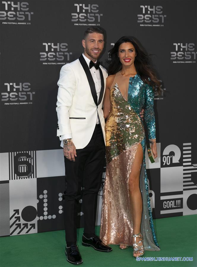El jugador Sergio Ramos (i), de Real Madrid, y su pareja, Pilar Rubio (d), llegan a la alfombra verde previo a los Premios "The Best FIFA 2018" en Londres, Reino Unido, el 24 de septiembre de 2018. (Xinhua/Han Yan)
