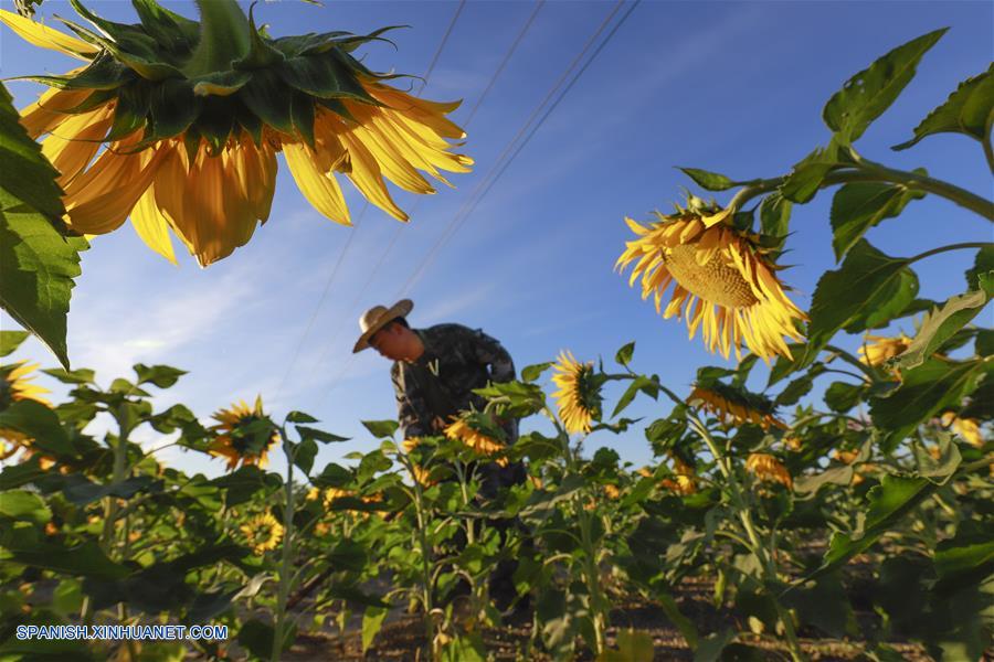 HEBEI, septiembre 25, 2018 (Xinhua) -- Imagen del 24 de septiembre de 2018 de un agricultor trabajando en los campos de cultivo de girasol, en la villa de Jingziyu del municipio de Xiaochang en la ciudad de Zunhua, provincia de Hebei, en el norte de China. (Xinhua/Liu Mancang)