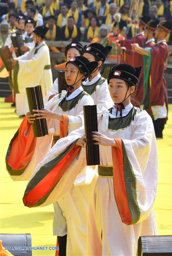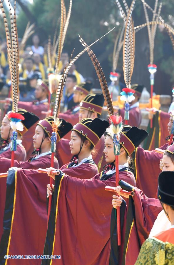 SHANDONG, septiembre 28, 2018 (Xinhua) -- Una ceremonia es llevada a cabo para conmemorar el 2,569 aniversario del nacimiento del antiguo sabio y educador chino Confucio, en el Templo de Confucio en Qufu, su ciudad natal, en la provincia de Shandong, en el este de China, el 28 de septiembre de 2018. Confucio (551-479 aC), educador y filósofo, fundó el confucianismo, una escuela de pensamiento que influyó profundamente en las generaciones posteriores. (Xinhua/Wang Nan)