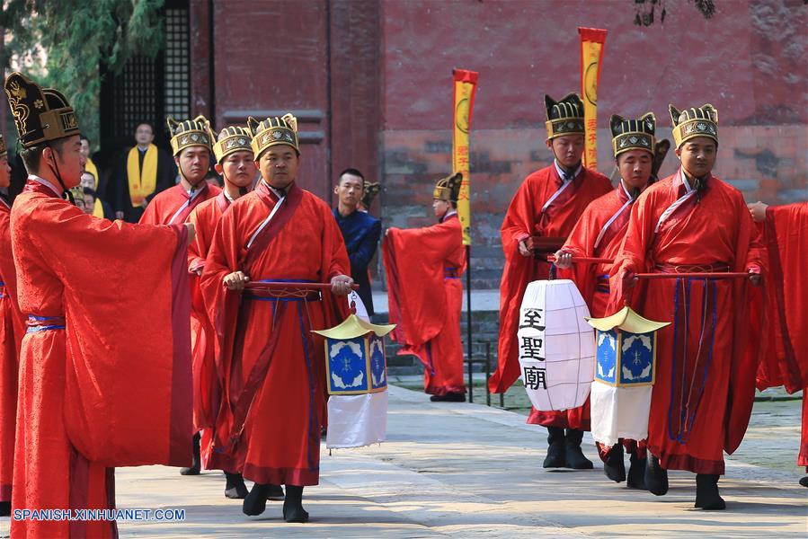 SHANDONG, septiembre 28, 2018 (Xinhua) -- Una ceremonia es llevada a cabo para conmemorar el 2,569 aniversario del nacimiento del antiguo sabio y educador chino Confucio, en el Templo de Confucio en Qufu, su ciudad natal, en la provincia de Shandong, en el este de China, el 28 de septiembre de 2018. Confucio (551-479 a.C.), educador y filósofo, fundó el confucianismo, una escuela de pensamiento que influyó profundamente en las generaciones posteriores. (Xinhua/Xu Suhui)