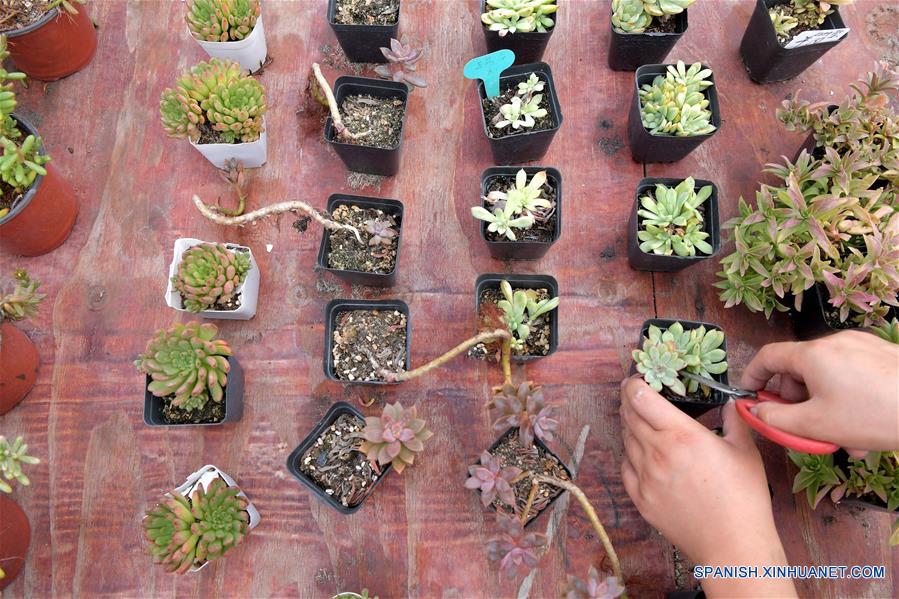 Imagen del 28 de septiembre de 2018 de una empleada podando las plantas suculentas en un invernadero dirigido por Peng Rong, en el municipio de Xicun de la ciudad de Yichun, provincia de Jiangxi, en el este de China. Peng Rong comenzó a cultivar las plantas suculentas desde 2014, después de graduarse de la universidad. (Xinhua/Peng Zhaozhi)