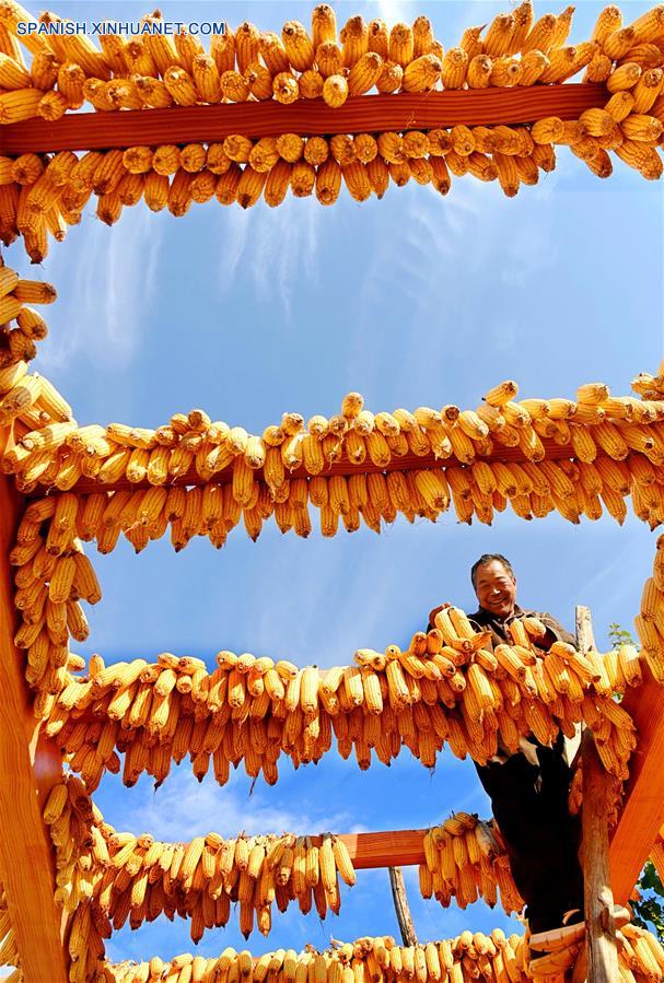 Imagen del 27 de septiembre de 2018 de un agricultor aireando maíz recién cosechado, en la villa de Longwangya de la ciudad de Zibo, provincia de Shandong, en el este de China. (Xinhua/Zhao Dongshan)