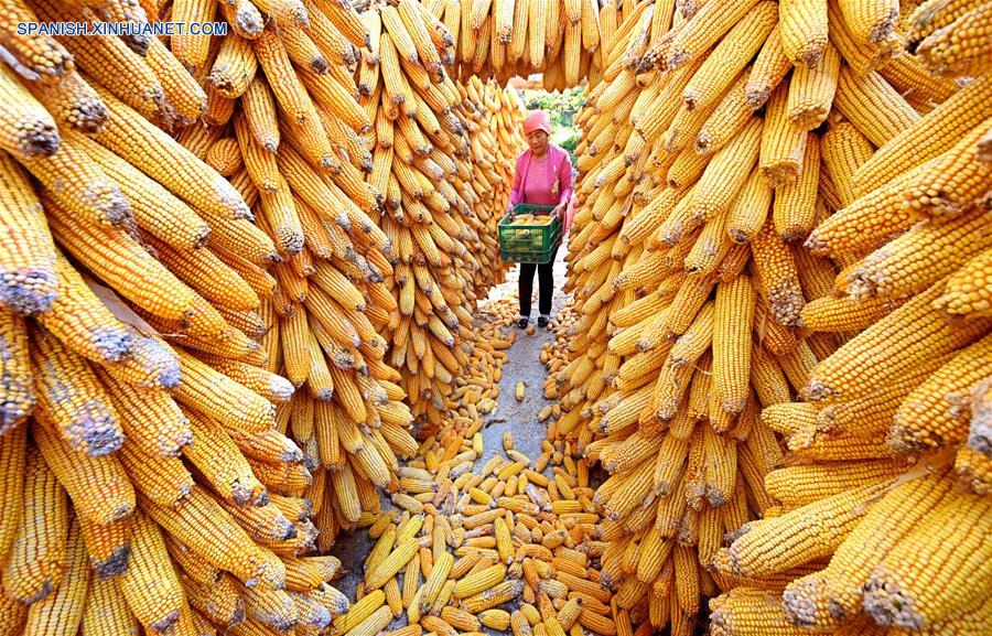 septiembre 29, 2018 (Xinhua) -- Imagen del 27 de septiembre de 2018 de una agricultora transportando maíz recién cosechado, en la villa de Nanbaozhuang de la ciudad de Zibo, provincia de Shandong, en el este de China. (Xinhua/Zhao Dongshan)