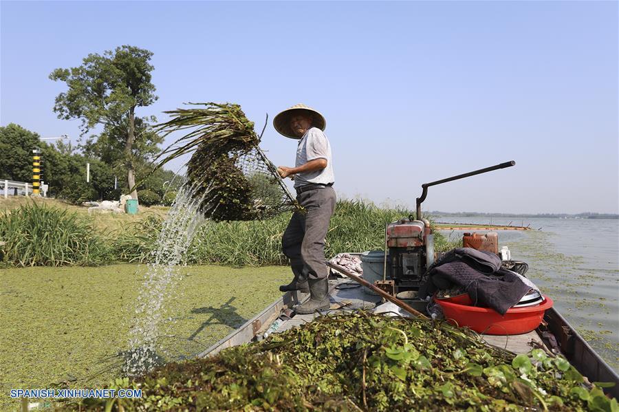 JIANGSU, octubre 4, 2018 (Xinhua) -- Un trabajador retira las plantas del Lago Baima, en la ciudad de Huai'an, provincia de Jiangsu, en el este de China, el 4 de octubre de 2018. Las personas de diversos sectores permanecen en sus puestos de trabajo durante las vacaciones del Día Nacional. (Xinhua/Wan Zhen)