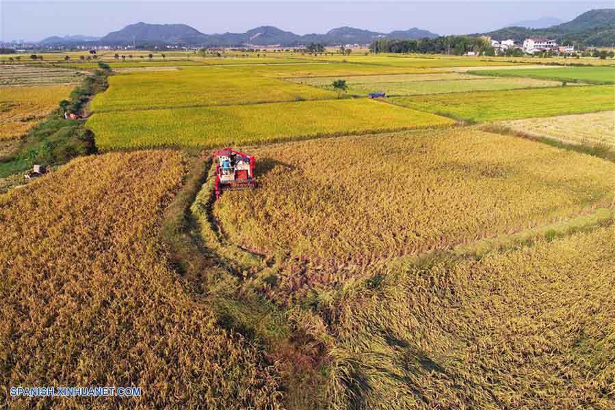 JIANGXI, octubre 5, 2018 (Xinhua) -- Un residente opera una segadora para cosechar arroz, en la villa de Kongfang de la localidad de Heyuan en el condado de Jinxi, provincia de Jiangxi, en el este de China, el 5 de octubre de 2018. (Xinhua/Deng Xingdong)