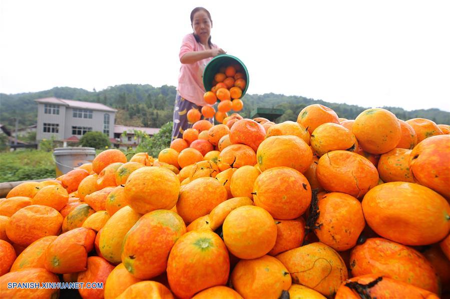 JIANGXI, octubre 5, 2018 (Xinhua) -- Imagen del 4 de octubre de 2018 de una residente vertiendo frutas de Trichosanthes Kirilowii cosechadas, en la villa de Shankou del municipio de Gaohu en el condado de Jing'an, provincia de Jiangxi, en el este de China. (Xinhua/Deng Xingdong)