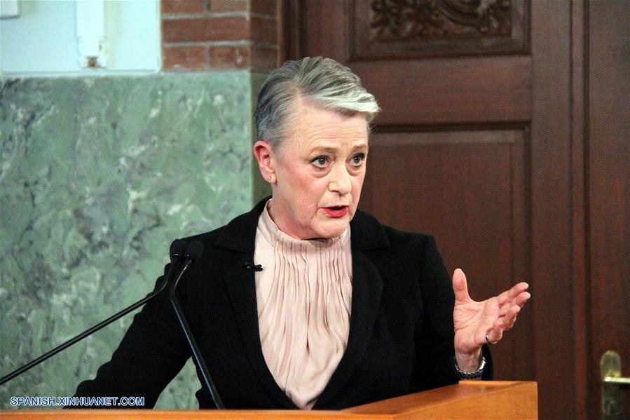 OSLO, octubre 5, 2018 (Xinhua) -- Berit Reiss-Andersen, presidenta del Comité Noruego del Nobel, anuncia a los ganadores del Premio Nobel de la Paz 2018, en Oslo, Noruega, el 5 de octubre de 2018. El ginecólogo congole?o Denis Mukwege y la activista de derechos humanos yazidí de Irak, Nadia Murad, ganaron el viernes el Premio Nobel de la Paz 2018 "por sus esfuerzos por poner fin al uso de la violencia sexual como arma de guerra", anunció el Comité Noruego del Nobel. (Xinhua/Zhang Shuhui)