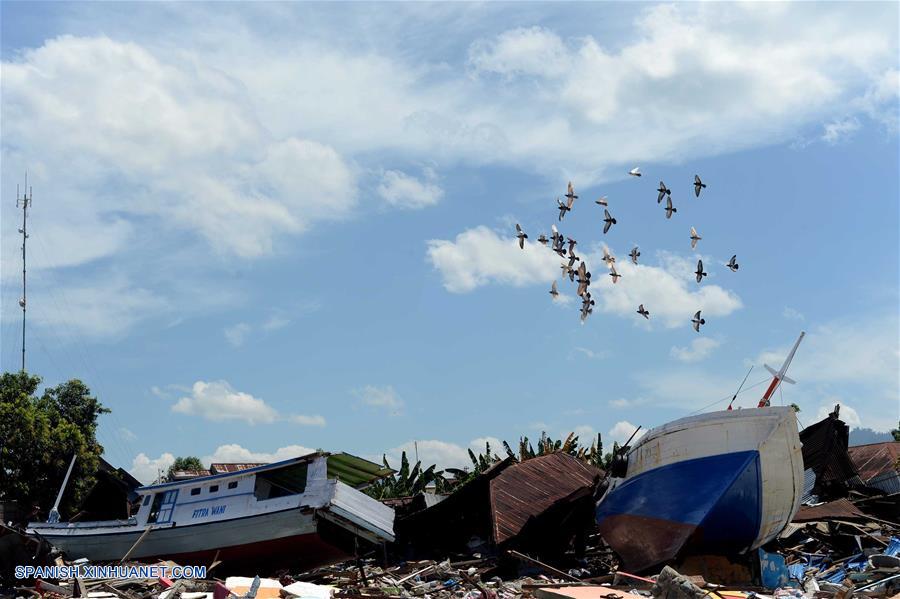 DONGGALA, octubre 5, 2018 (Xinhua) -- Una bandada de palomas vuela cerca de las embarcaciones varadas, en Donggala, provincia de Sulawesi Central, Indonesia, el 5 de octubre de 2018. El número de muertos de los terremotos y el tsunami que asolaron la provincia indonesia de Sulawesi Central hace una semana subió a 1,571 y la operación de búsqueda y rescate se ha extendido, informó el viernes el portavoz de la oficina nacional de gestión de desastres. (Xinhua/Agung Kuncahya B.)