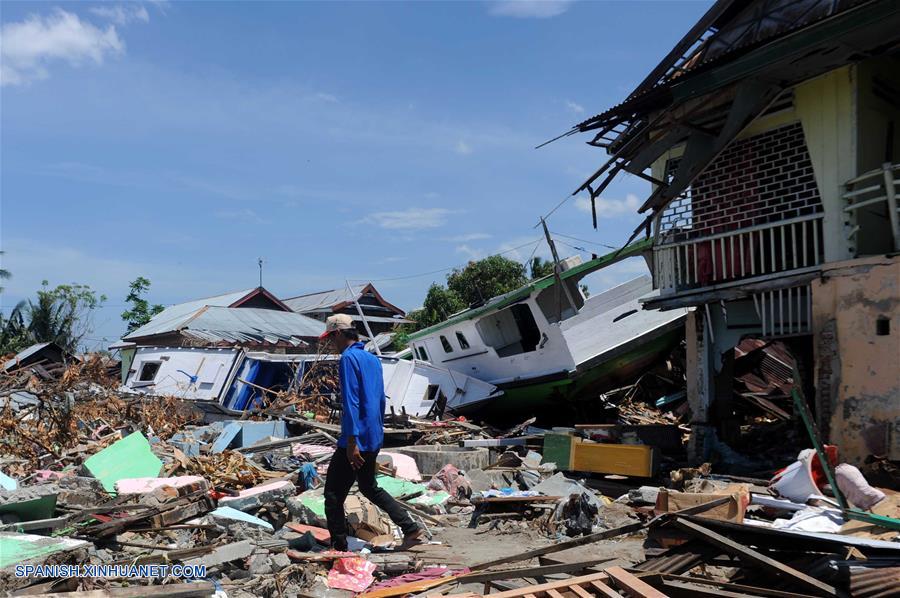 DONGGALA, octubre 5, 2018 (Xinhua) -- Un hombre busca artículos rescatables entre los escombros de una vivienda, en Donggala, provincia de Sulawesi Central, Indonesia, el 5 de octubre de 2018. El número de muertos de los terremotos y el tsunami que asolaron la provincia indonesia de Sulawesi Central hace una semana subió a 1,571 y la operación de búsqueda y rescate se ha extendido, informó el viernes el portavoz de la oficina nacional de gestión de desastres. (Xinhua/Agung Kuncahya B.)
