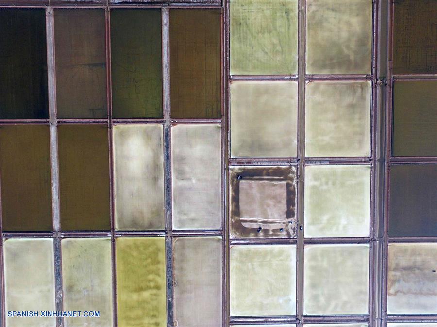 SHANDONG, octubre 4, 2018 (Xinhua) -- Trabajadores manipulan máquinas para cosechar sal en las salinas en la ciudad de Binzhou, provincia de Shandong, en el este de China, el 4 de octubre de 2018. Las salinas entraron en temporada de cosecha recientemente. (Xinhua/Guo Zhihua)