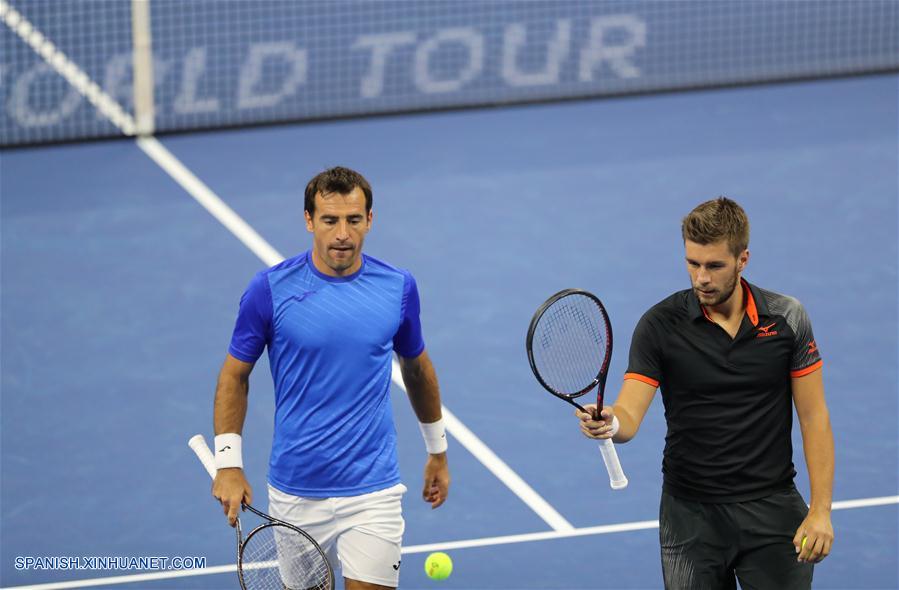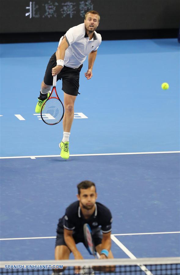BEIJING, octubre 6, 2018 (Xinhua) -- Oliver Marach (arriba), de Austria, y Mate Pavic (abajo), de Croacia, compiten ante Ivan Dodig y Nikola Mektic, de Croacia, durante un partido de dobles varonil de semifinal del torneo de tenis Abierto de China, celebrado en Beijing, capital de China, el 6 de octubre de 2018. Ivan Oliver Marach y Mate Pavic ganaron el encuentro. (Xinhua/Luo Yuan)