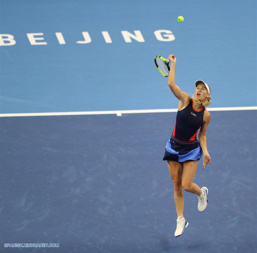 BEIJING, octubre 6, 2018 (Xinhua) -- Caroline Wozniacki, de Dinamarca, sirve la pelota a Wang Qiang, de China, durante un partido individual femenil de semifinal del torneo de tenis Abierto de China, celebrado en Beijing, capital de China, el 6 de octubre de 2018. Caroline Wozniacki ganó el encuentro. (Xinhua/Luo Yuan)