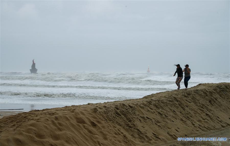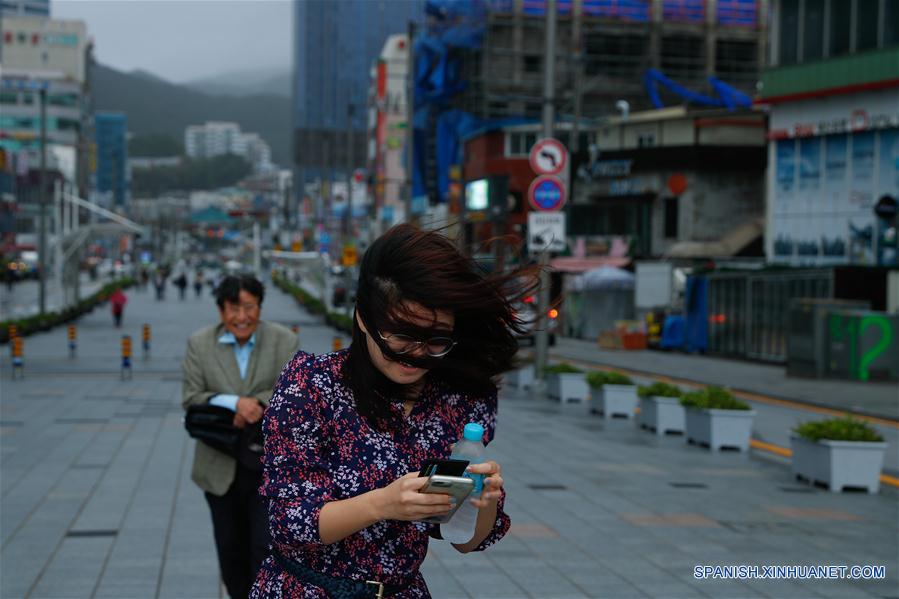 BUSAN, octubre 6, 2018 (Xinhua) -- Personas caminan contra el fuerte viento cerca de la playa Haeundae, en Busan, República de Corea, el 6 de octubre de 2018. El tifón Kong-rey tocó tierra el sábado en República de Corea, trayendo fuerte viento y lluvia intensa. (Xinhua/Wang Jingqiang)