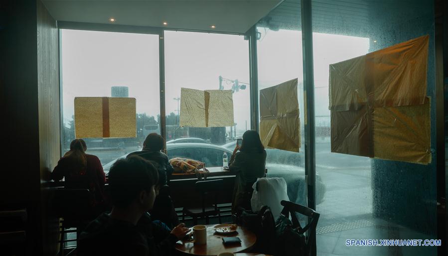BUSAN, octubre 6, 2018 (Xinhua) -- Personas permanecen en una cafetería con ventanas selladas en preparación para el tifón cerca de la playa Haeundae, en Busan, República de Corea, el 6 de octubre de 2018. El tifón Kong-rey tocó tierra el sábado en República de Corea, trayendo fuerte viento y lluvia intensa. (Xinhua/Wang Jingqiang)