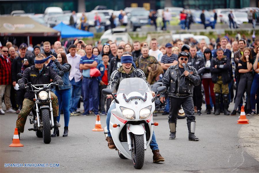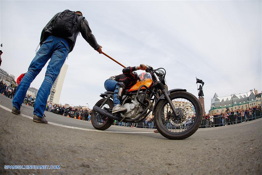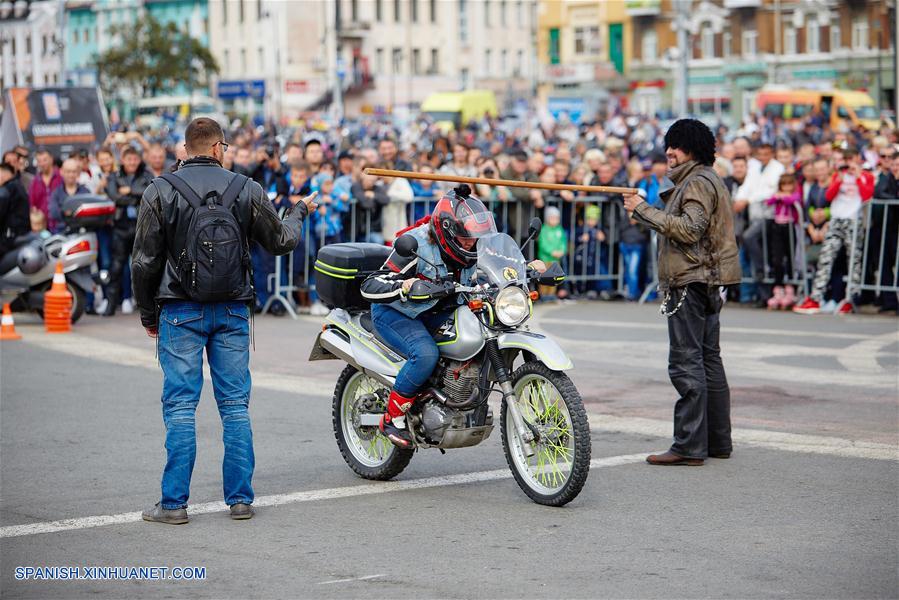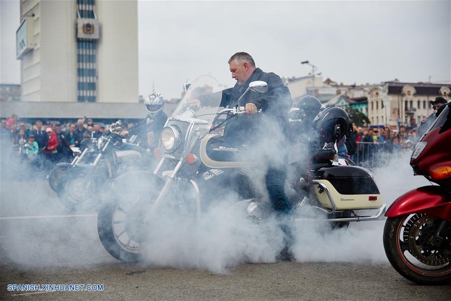 VLADIVOSTOK, octubre 6, 2018 (Xinhua) -- Pilotos se preparan para realizar un truco durante un rally de motocicletas llevado a cabo en Vladivostok, Rusia, el 6 de octubre de 2018. (Xinhua/Wu Gang)