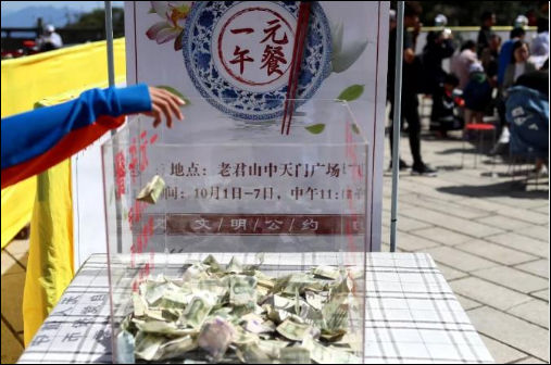 Como enjambres, los turistas formaron filas para pagar el almuerzo de una singular manera: depositar 1 renminbi (0,15 dólares estadounidenses) en una caja transparente de donaciones.