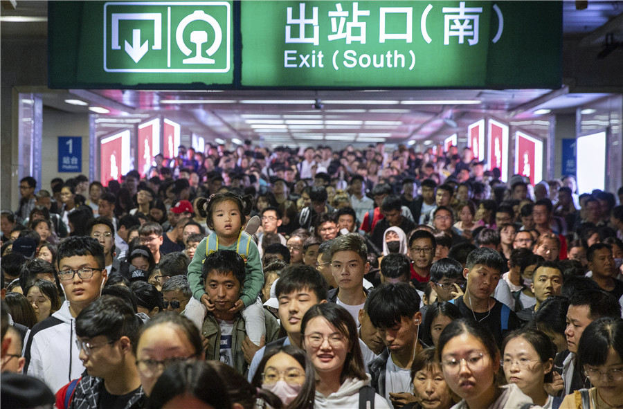 Gran número de viajeros llegan a la Estación de Tren de Nanjing, provincia de Jiangsu. En lugares de todo el país, este 7 de octubre se verificaron picos en el transporte debido al último día de la semana de vacaciones por el Día Nacional de China.(Por Su Yang/ China Daily)