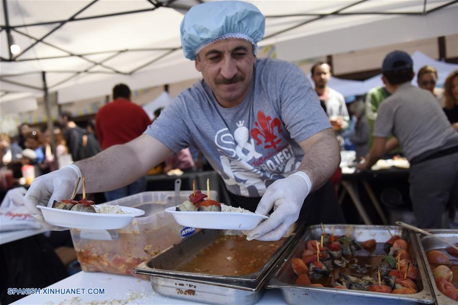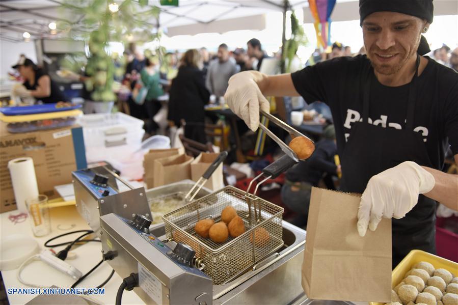 MONTEVIDEO, octubre 6, 2018 (Xinhua) -- Un cocinero turco prepara comida típica de su país durante la feria gastronómica "Ciudad vieja sin fronteras", en el marco del 24 Día del Patrimonio y 70 aniversario de la Declaración Universal de Derechos Humanos, llevada a cabo en el Museo de las Migraciones (MUMI), en Montevideo, capital de Uruguay, el 6 de octubre de 2018. De acuerdo con información de la prensa local, la feria gastronómica "Ciudad vieja sin fronteras", organizada por la Secretaría de Equidad Etnico Racial y Poblaciones Migrantes (SEERPM) de la Intendencia de Montevideo, se realiza como parte de la campa?a "El mundo en tu ciudad", que desarrolla actividades durante todo octubre con el objetivo de visibilizar la situación migrante en Montevideo. (Xinhua/Nicolás Celaya)
