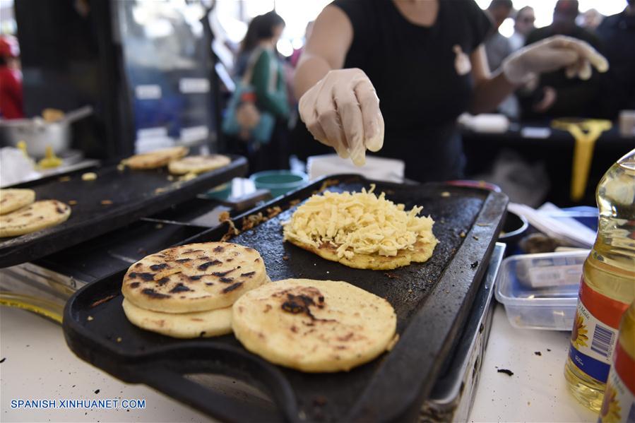 MONTEVIDEO, octubre 6, 2018 (Xinhua) -- Una cocinera venezolana prepara comida típica de su país durante la feria gastronómica "Ciudad vieja sin fronteras", en el marco del 24 Día del Patrimonio y 70 aniversario de la Declaración Universal de Derechos Humanos, llevada a cabo en el Museo de las Migraciones (MUMI), en Montevideo, capital de Uruguay, el 6 de octubre de 2018. De acuerdo con información de la prensa local, la feria gastronómica "Ciudad vieja sin fronteras", organizada por la Secretaría de Equidad Etnico Racial y Poblaciones Migrantes (SEERPM) de la Intendencia de Montevideo, se realiza como parte de la campa?a "El mundo en tu ciudad", que desarrolla actividades durante todo octubre con el objetivo de visibilizar la situación migrante en Montevideo. (Xinhua/Nicolás Celaya)