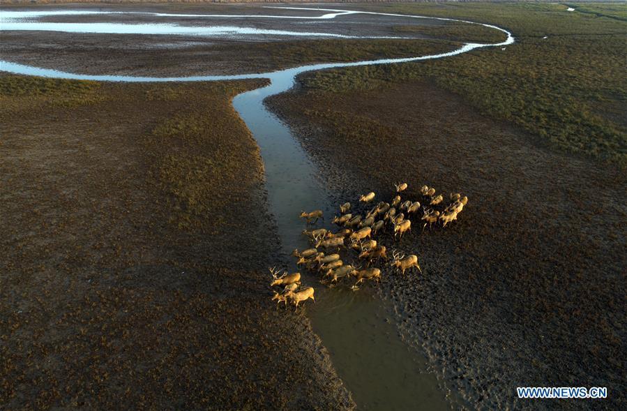 Foto aérea tomada el 4 de octubre de 2018 que muestra una manada de ciervos Milu que campean por los humedales de la Reserva Natural Nacional Dafeng Milu, Yancheng, provincia de Jiangsu, 4 de octubre del 2018. (Foto: Xinhua/ He Jinghua)