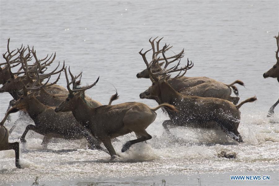 Yancheng, Jiangsu, 08/10/2018(El Pueblo en Línea) - Una manada de ciervos Milu campean por los humedales de la Reserva Natural Nacional Dafeng Milu, Yancheng, provincia de Jiangsu, 4 de octubre del 2018. (Foto: Xinhua/ He Jinghua)