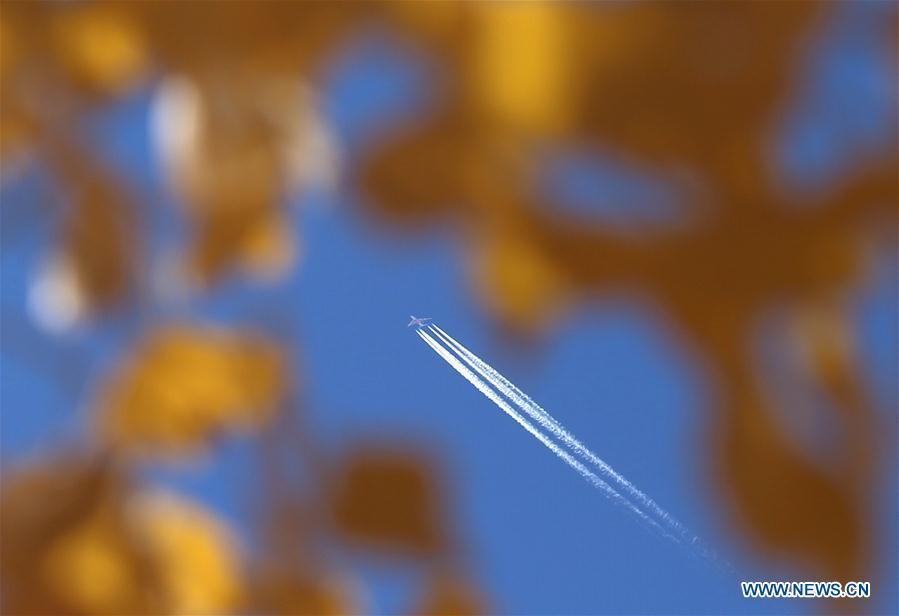 Un aeroplano vuela sobre el bosque de Populus euphratica, comúnmente conocido como el Desierto de álamos, en Mogao, Dunhuang, provincia de Gansu, 6 de octubre del 2018. (Foto: Xinhua/ Zhang Xiaoliang)