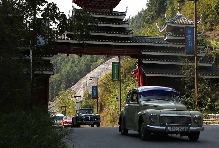 Liping, Guizhou, 10/10/2018(El Pueblo en Línea) - Después de viajar a través de siete países, la caravana de 16 automóviles clásicos arriba en un pueblo de la etnia Dong, Liping, provincia de Guizhou, 8 de octubre del 2018. [Foto: proporcionada]