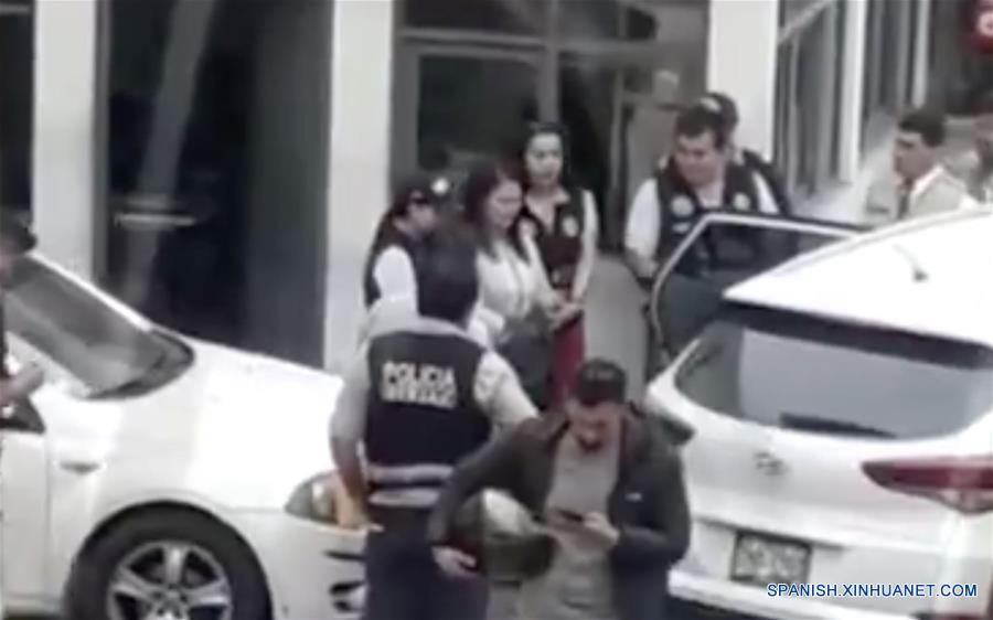 LIMA, octubre 10, 2018 (Xinhua)-- Imagen distribuida por la Agencia Peruana de Noticias Andina de una captura de pantalla tomada de la se?al del Canal N de Perú donde aparece Keiko Fujimori, lideresa opositora peruana del partido político Fuerza Opositora, escoltada durante su detención, en Lima, Perú, el 10 de octubre de 2018. La lideresa opositora peruana del partido político Fuerza Popular, Keiko Fujimori, fue detenida el miércoles por un plazo de 10 días cuando se presentó en el Ministerio Público en cumplimiento de una citación fiscal, confirmó su abogada Giuliana Loza. La hija del ex presidente Alberto Fujimori acudió la ma?ana del miércoles a la Fiscalía cumpliendo con una citación para declarar sobre los aportes que recibió su partido para la campa?a presidencial del a?o 2011, tras lo cual fue detenida ante un "peligro grave de fuga". (Xinhua/ANDINA)